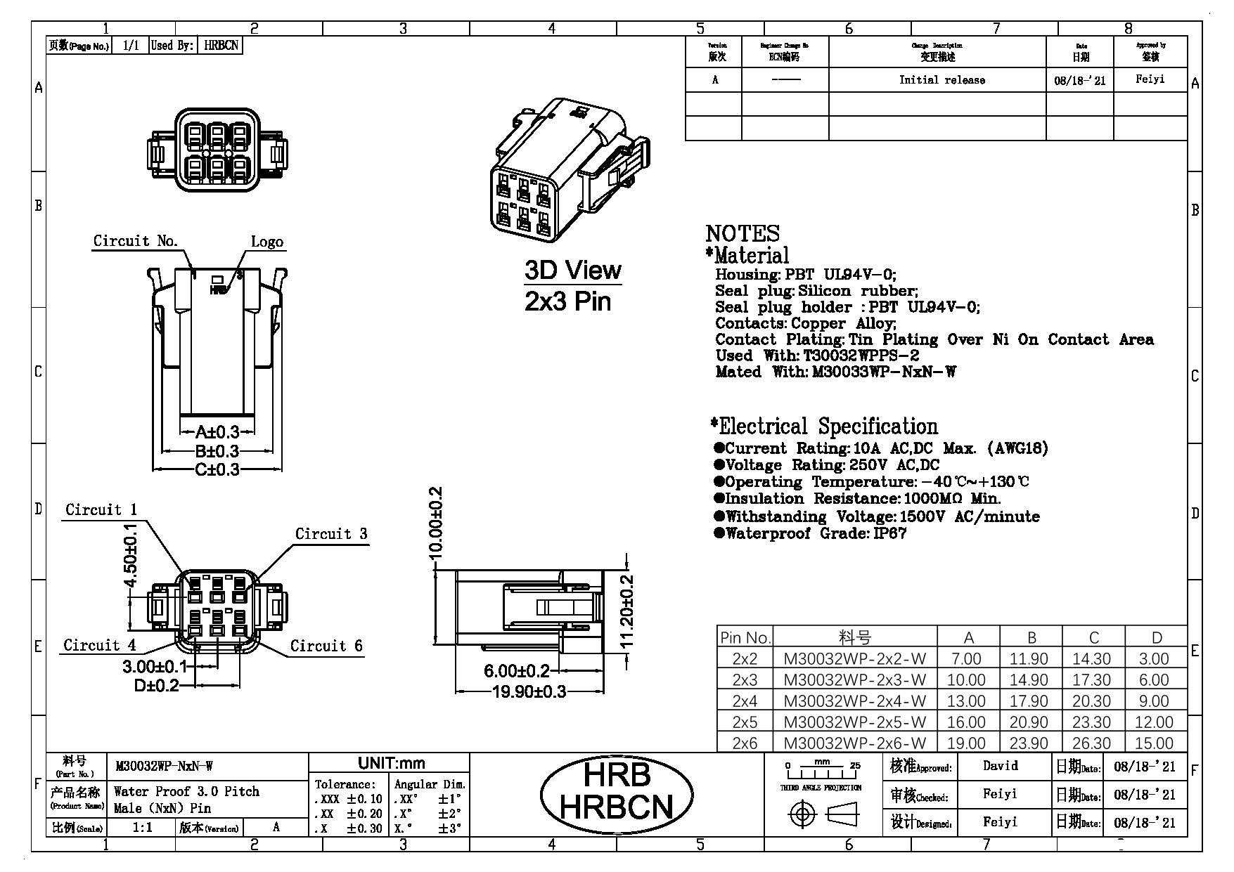 HRB wire to wire waterproof electrical connector meets the need for a small form factor waterproof connector. It has an IP67 waterproof rating per IEC 60529. It is on a 2.0mm pitch(contact to contact) and 4.0mm row to row spacing for double row versions. The overall size when mated is just 30.2mm for the wire to wire series 21.0m for the wire to PCB version.