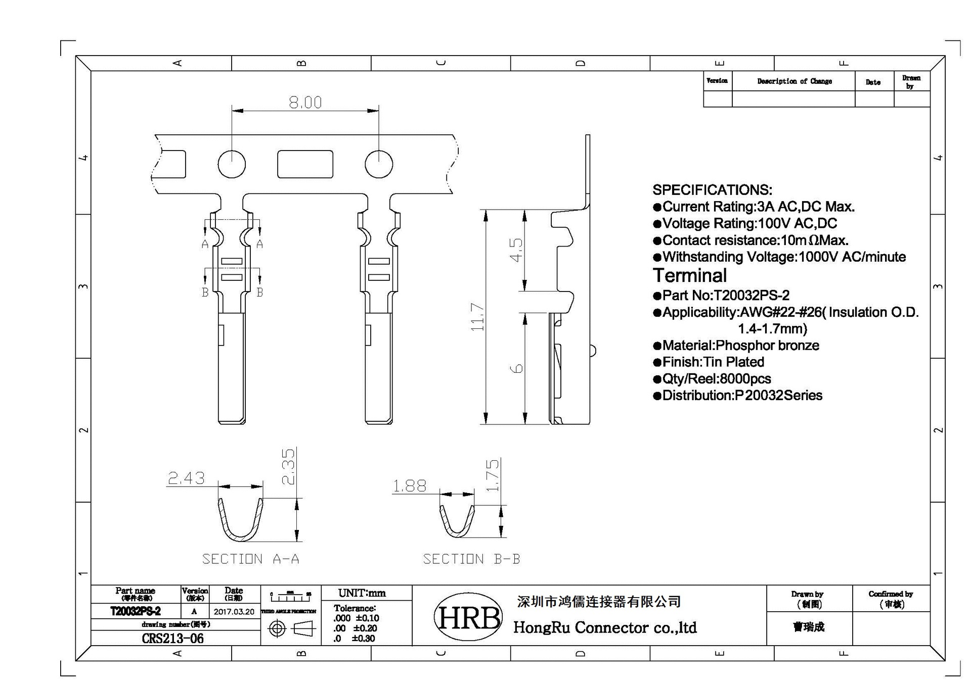当前所在位置: 首页 » 产品 » 防水连接器(IP67 IP68 IP69K) » 2.0mm防水 标准款 » HRBCN 2.0mm磷铜母端T20032PS-2